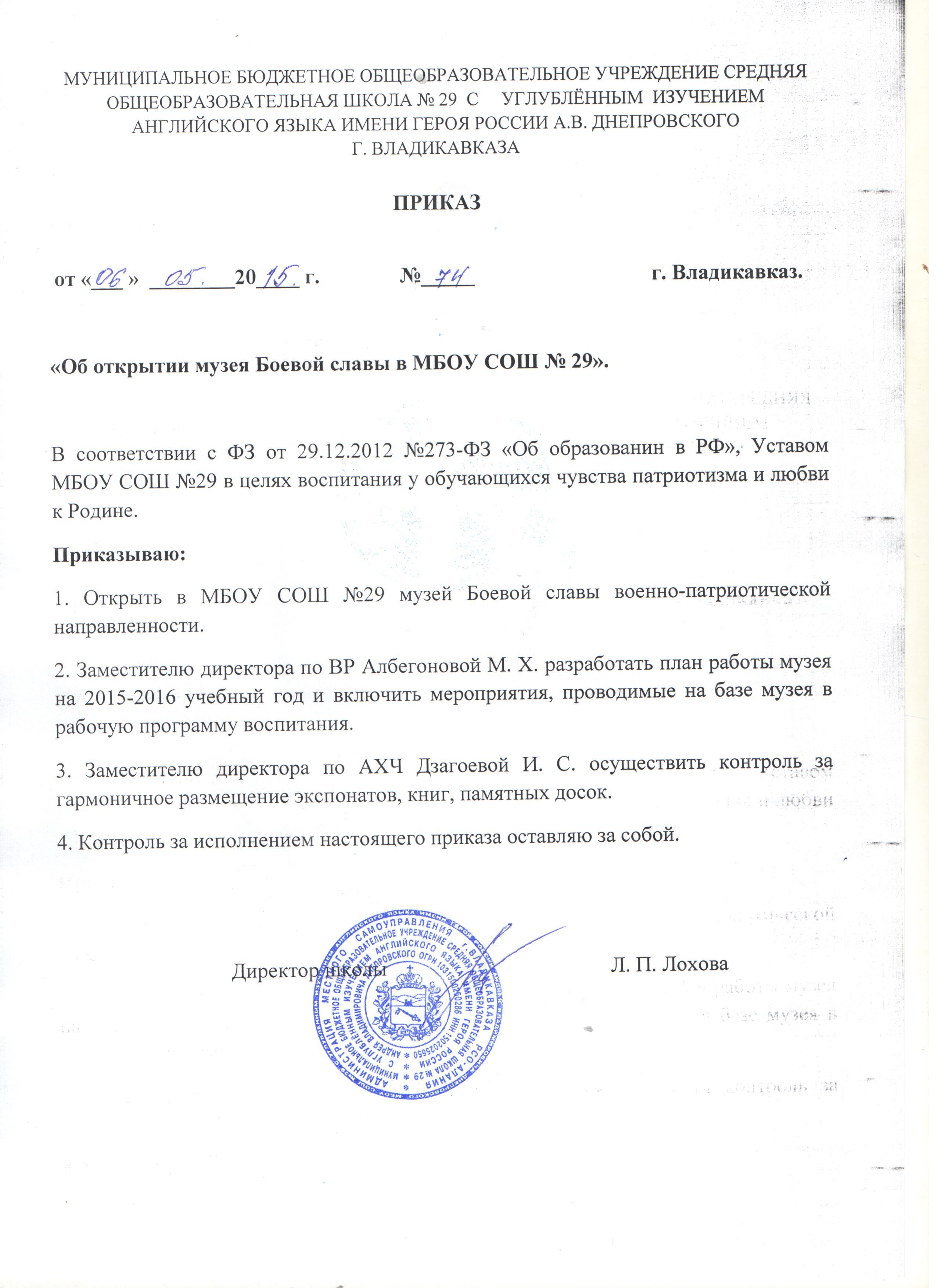 Приказ об открытии музея Боевой славы